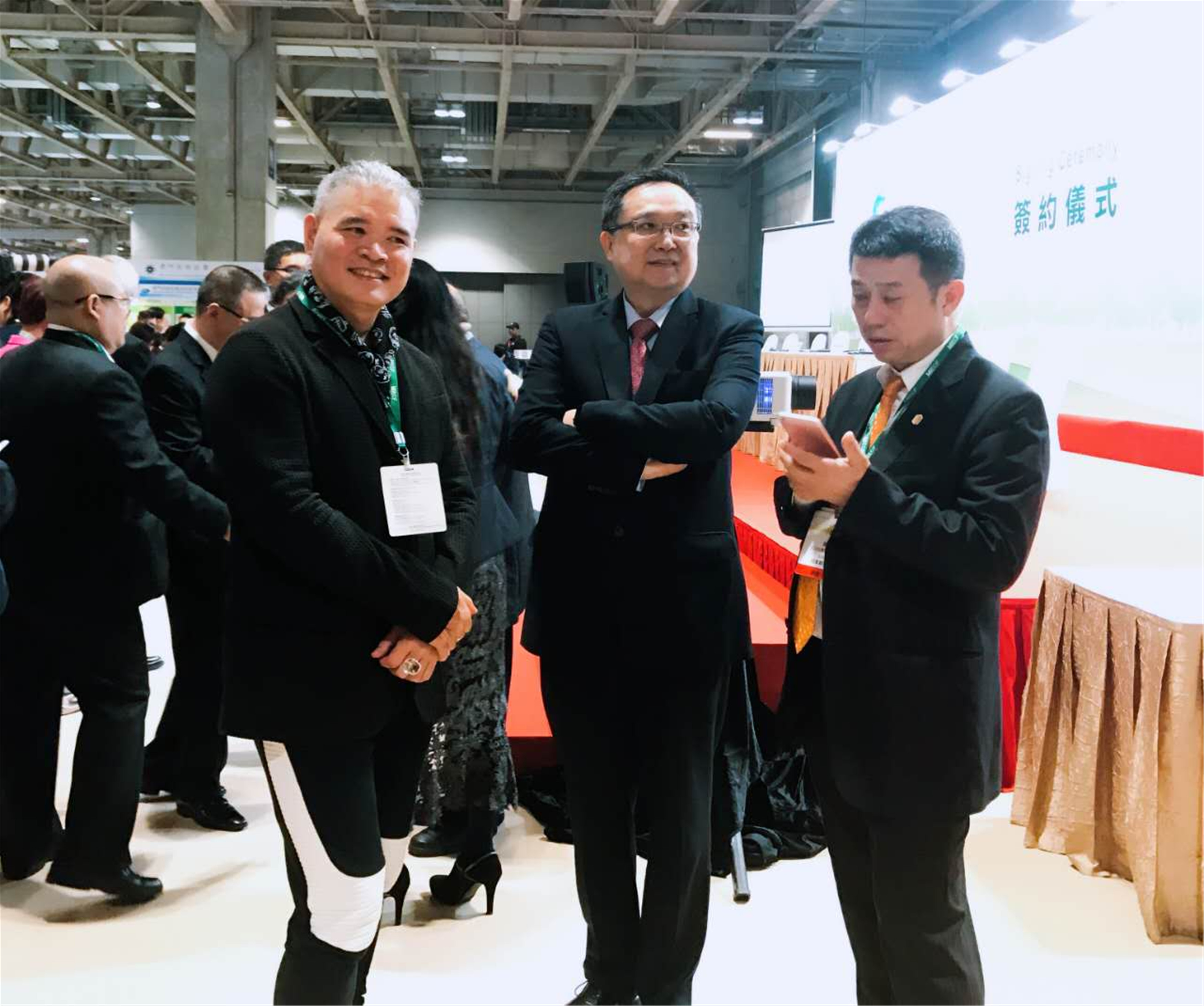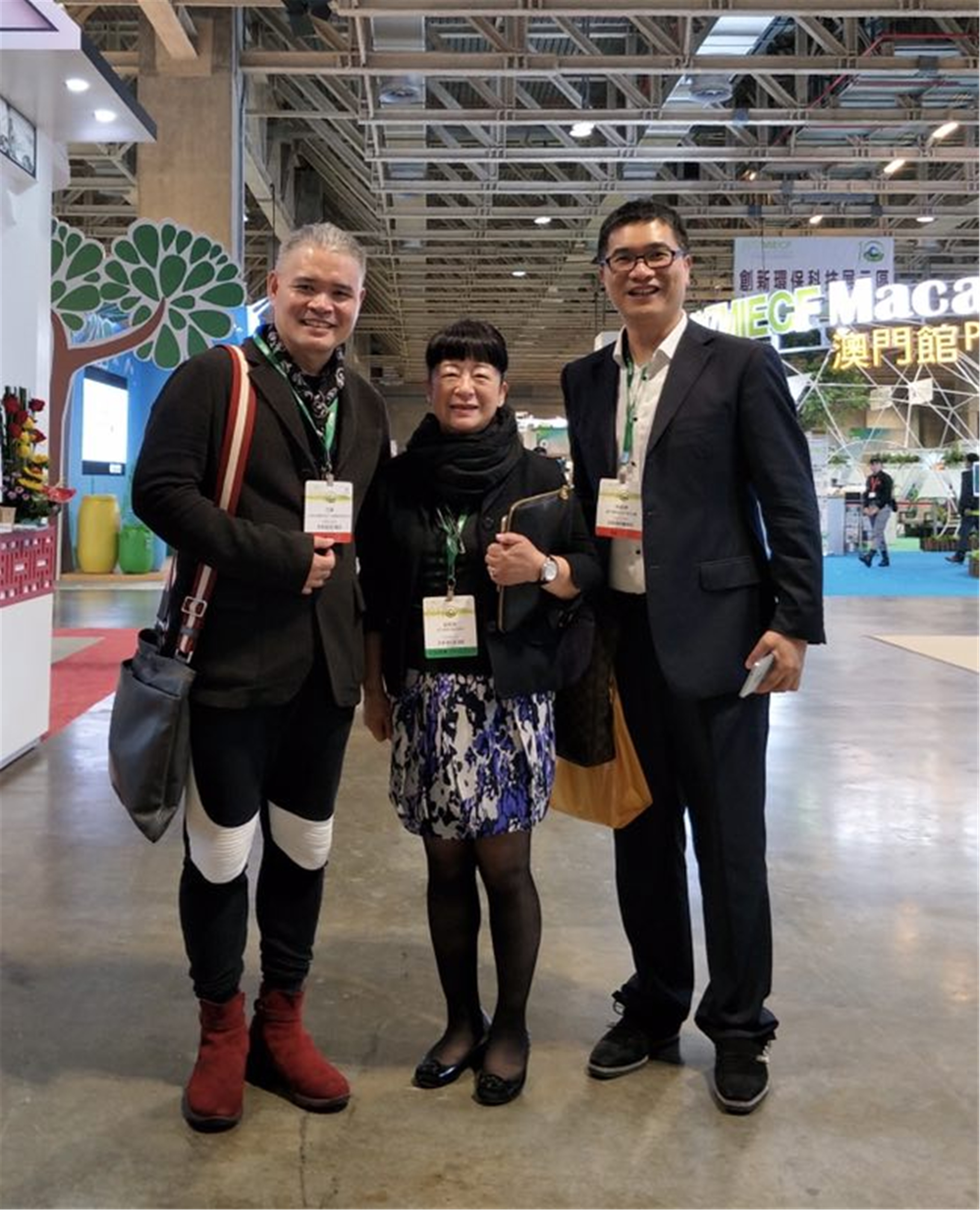 三原色(國際)設計工程顧問有限公司符軍董事長(左)、材料委員會主任委員陳國華先生與澳門貿易投資促進局執行委員劉關華女士交流合影