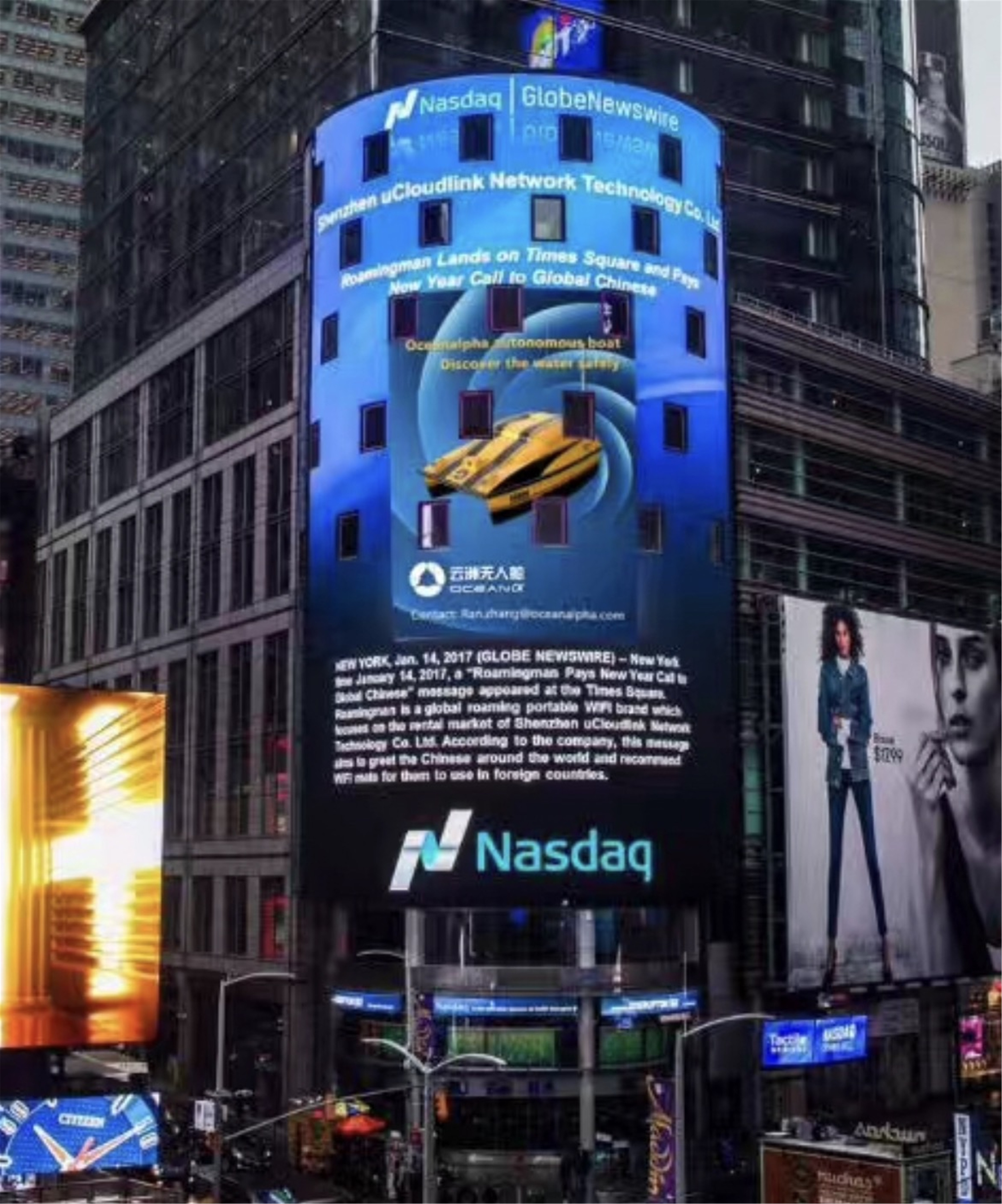 在今年北京時間3月29日晚 24點 左右(美國東部時間3月29日 上午11點左右),雲州無人船登陸紐約時代廣場納斯達克大屏!