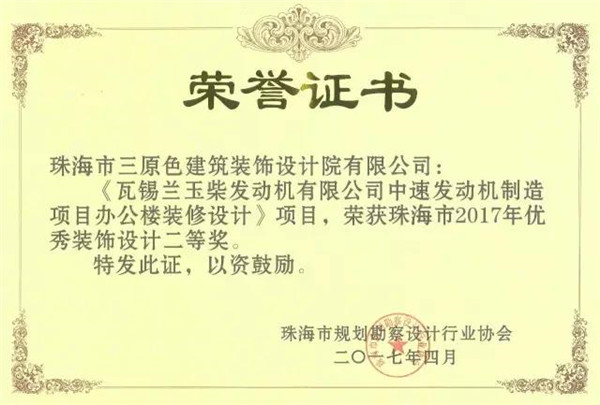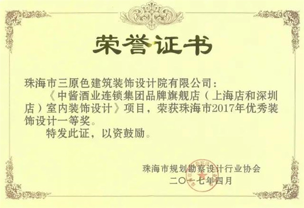 2017年5月5日,珠海市三原色建築裝飾設計院有限公司代表出席珠海市規劃勘察設計行業協會第五次會員代表大會暨珠海市2017年度優秀規劃勘察設計項目頒獎儀式,當天公司申報的《中醬酒業連鎖集團品牌旗艦店(上海店和深圳店)室內裝飾設計》和《瓦錫蘭玉柴發動機有限公司中速發動機制造項目辦公樓裝修設計》分別榮獲珠海市2017年優秀裝飾設計一等獎和二等獎,為業界所稱道。