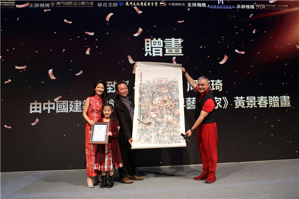 應澳門國際設計聯展組委會的熱情邀請,鳳凰衛視中文台“築夢天下”欄目主持人周瑛琦女士出席2017澳門國際設計聯展並友情擔任「國際設計師之夜」頒獎晚宴,助力年度國際設計交流盛會,由中國建築裝飾協會跨界藝術家黃景春先生贈畫。